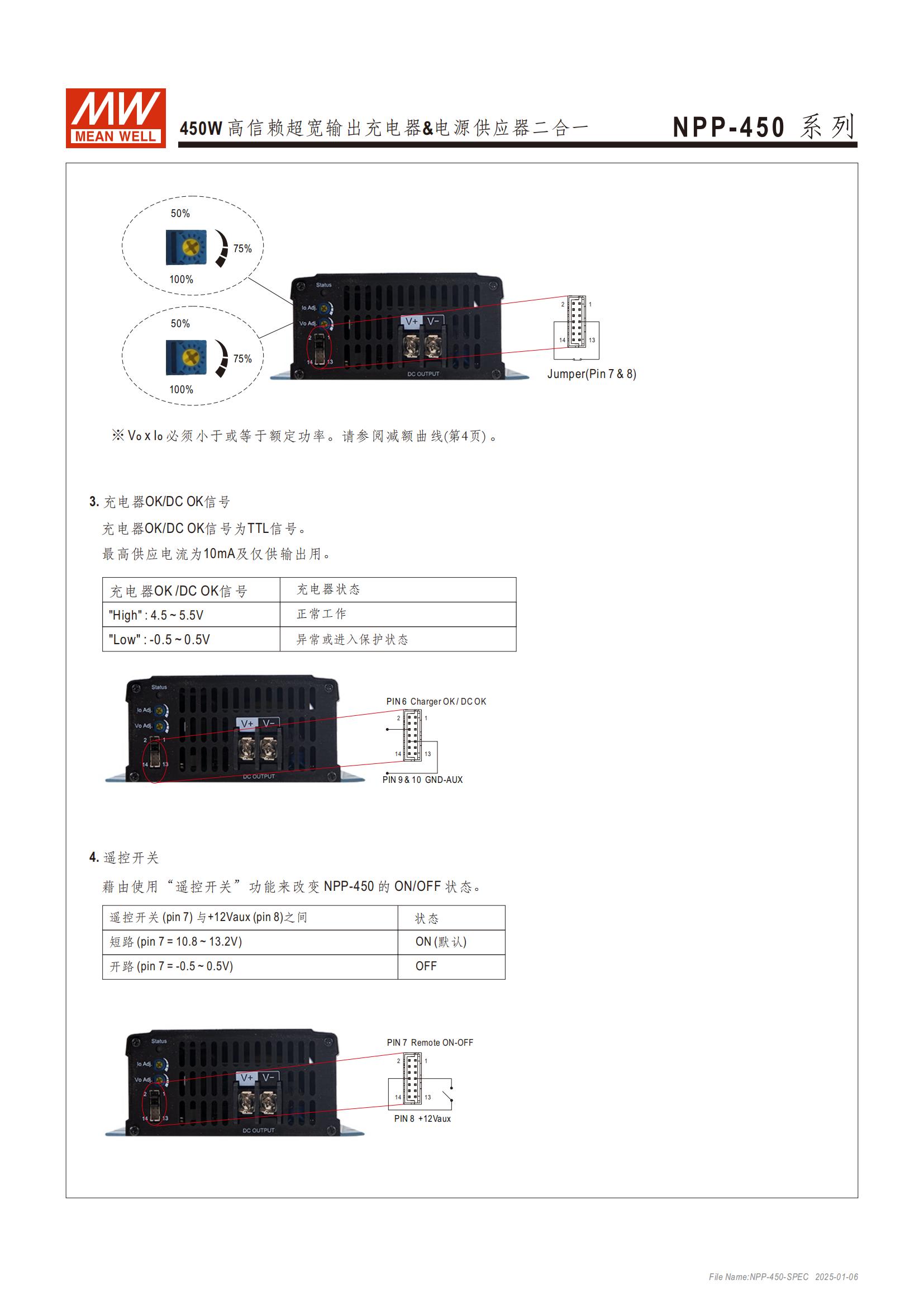 NPP-450是一款小型化并兼具充电器与电源供应器,一机双用,同时具备充电器或电源供应器两种使用模式,除了可当作三段式充电器对铅酸电池充电,亦可做为恒压输出电源供应器驱动一般负载设备,切换方式非常简便,只需拔除或插回面板上短路插PIN即可快速弹性变更使用模式。其他特点包含:超宽压输出,透过面板上VR可调输出电压(10.5~21V/21~42V/42~80V/54~100V)及输出电流50~100%、内建智能温控风扇,可减缓吵杂风扇声并提高风扇与电源整机寿命、-30~+70℃宽温操作,适用全球各地及不同安装环境场合、内建远程ON/OFF控制接点、通过信息类IEC/EN/UL62368-1及家电类EN60335-1/-2-29双领域安规认证,且内建多重智能保护功能,使用安全有保障,并提供3年保固,是一款物超所值、安全、耐用的双用途电源供应器。