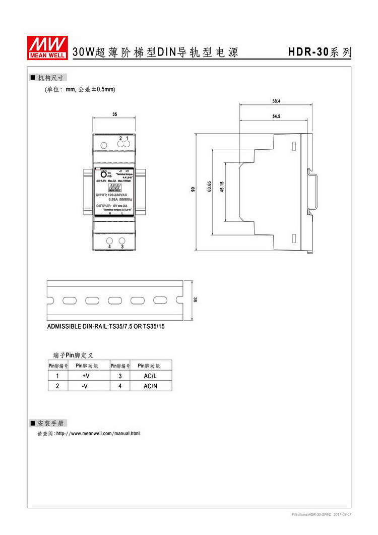 HDR系列 适用于楼宇建筑自动化及家用电器自动化控制的导轨电源,安装快捷省力,与小型断路器一样的阶梯型外观,适合安装于 DIN导轨 TS35 / 7.5 或 15。无接地线(ClassII),双重绝缘,是低空载待机损耗机型。