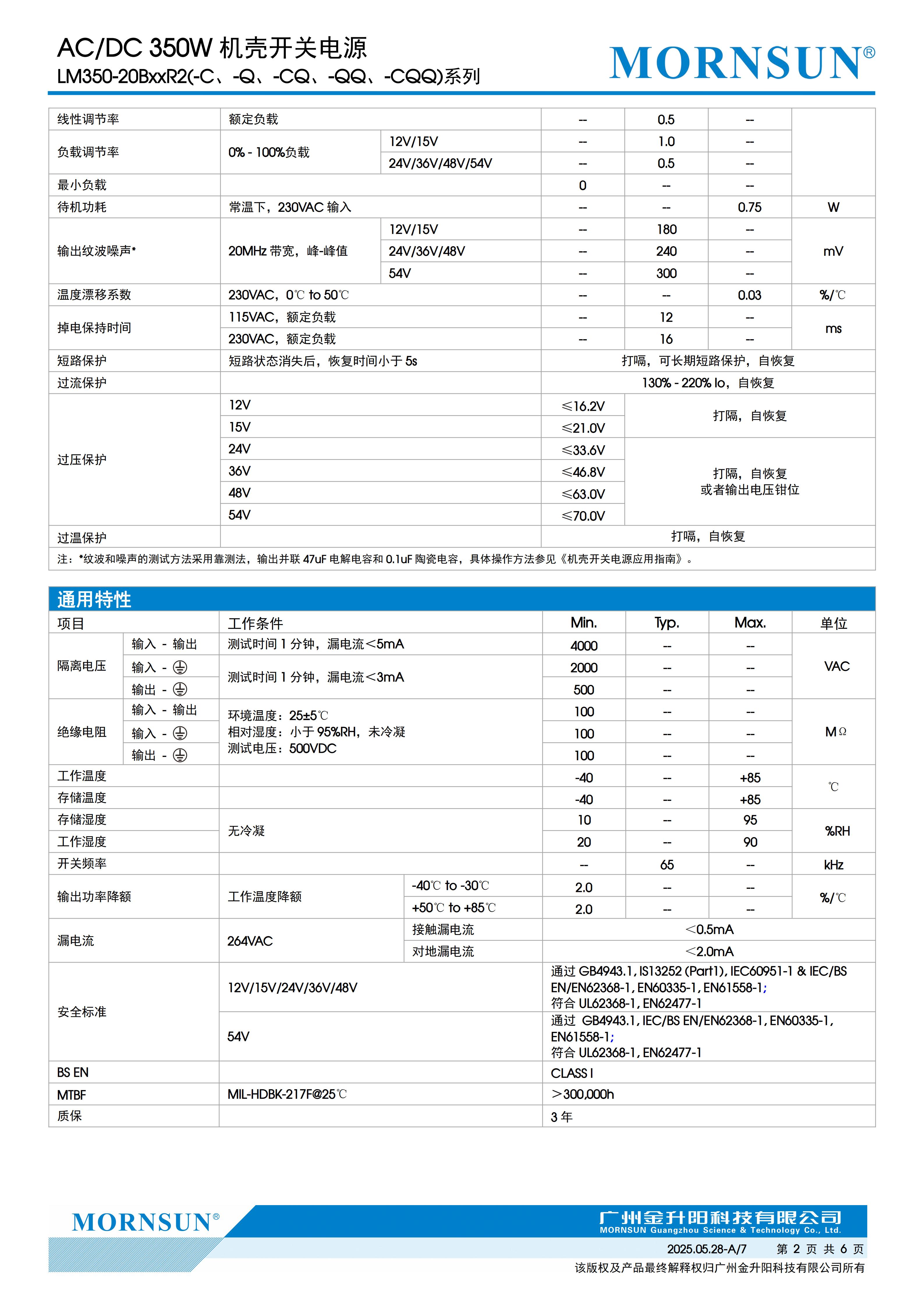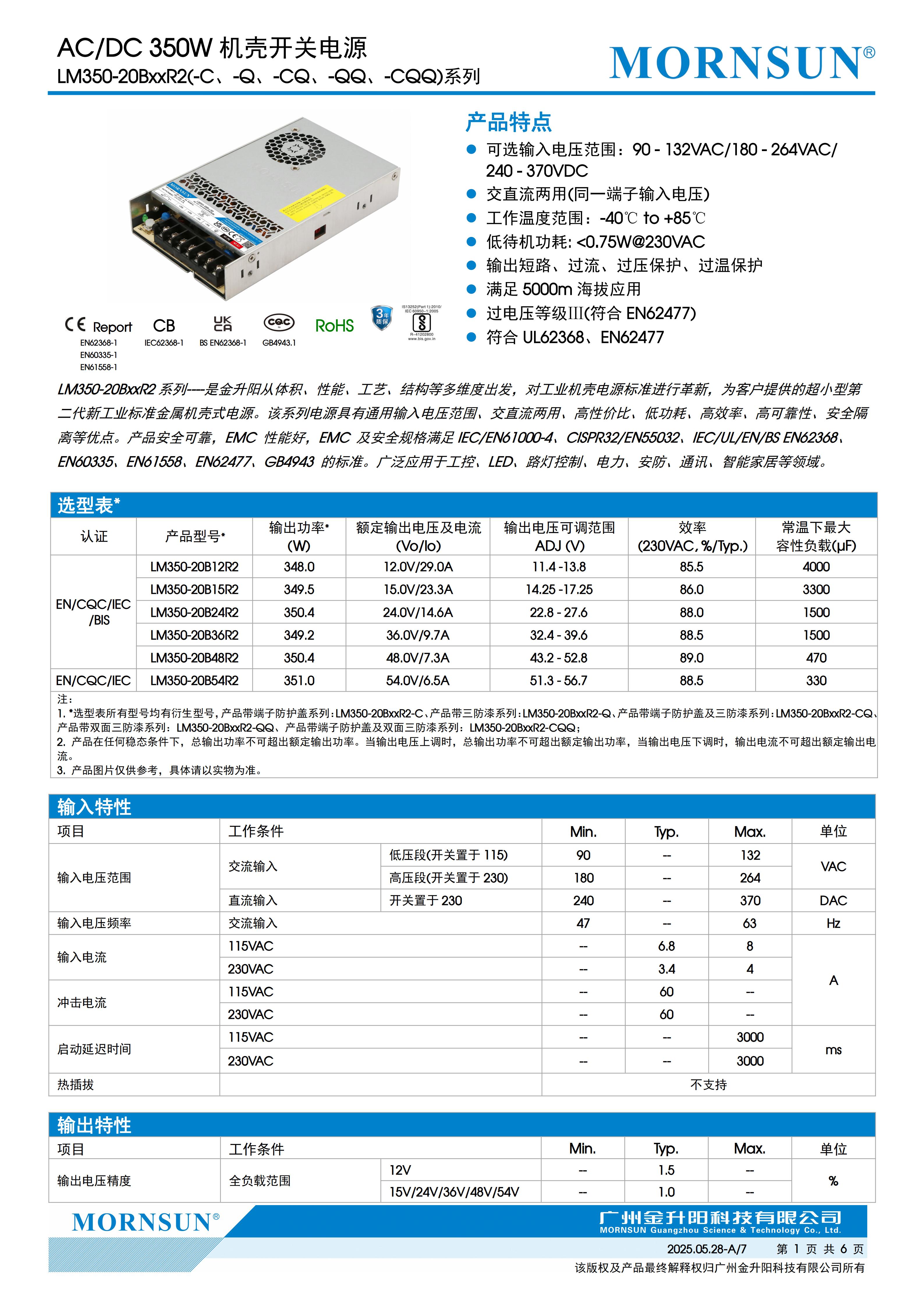 LM350系列----是金升阳从体积、性能、工艺、结构等多维度出发,对工业机壳电源标准进行革新,为客户提供的超小型第 二代新工业标准金属机壳式电源。该系列电源具有通用输入电压范围、交直流两用、高性价比、低功耗、高效率、高可靠性、安全隔 离等优点。产品安全可靠,EMC性能好,EMC及安全规格满足国际IEC/EN61000-4、CISPR32/EN55032、IEC/UL/EN/BSEN62368、 EN60335、EN61558、EN62477、GB4943的标准。广泛应用于工控、LED、路灯控制、电力、安防、通讯、智能家居等领域