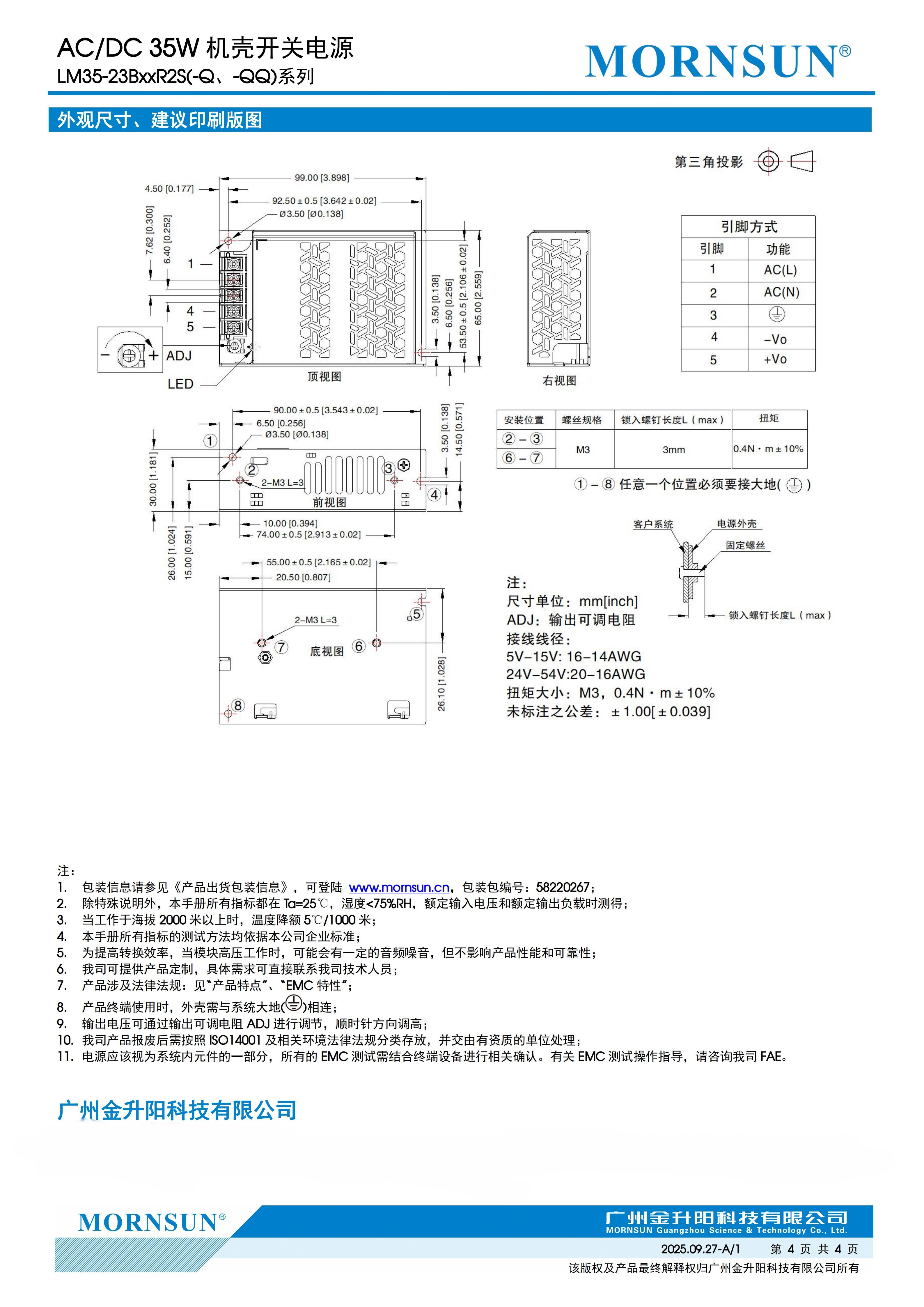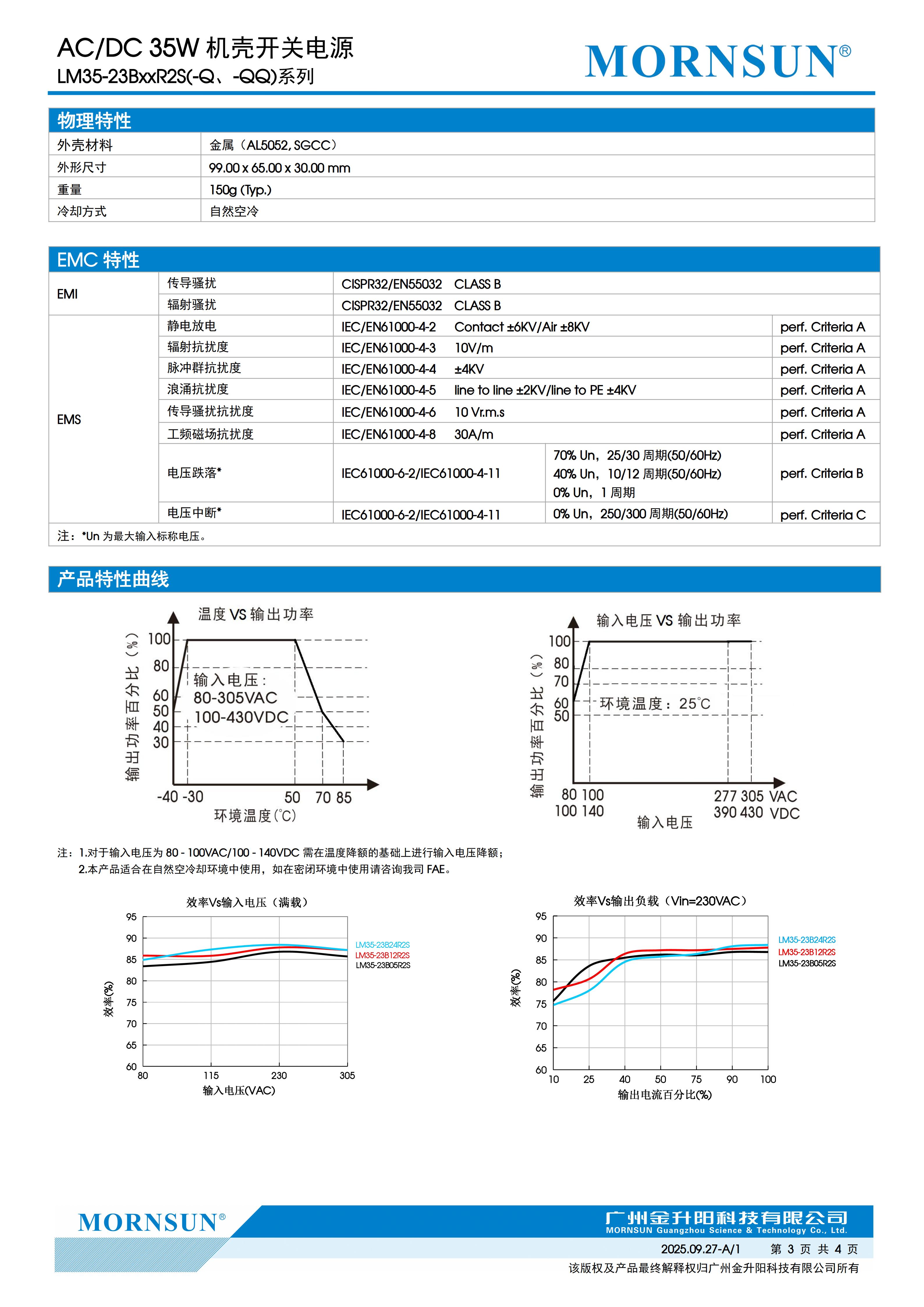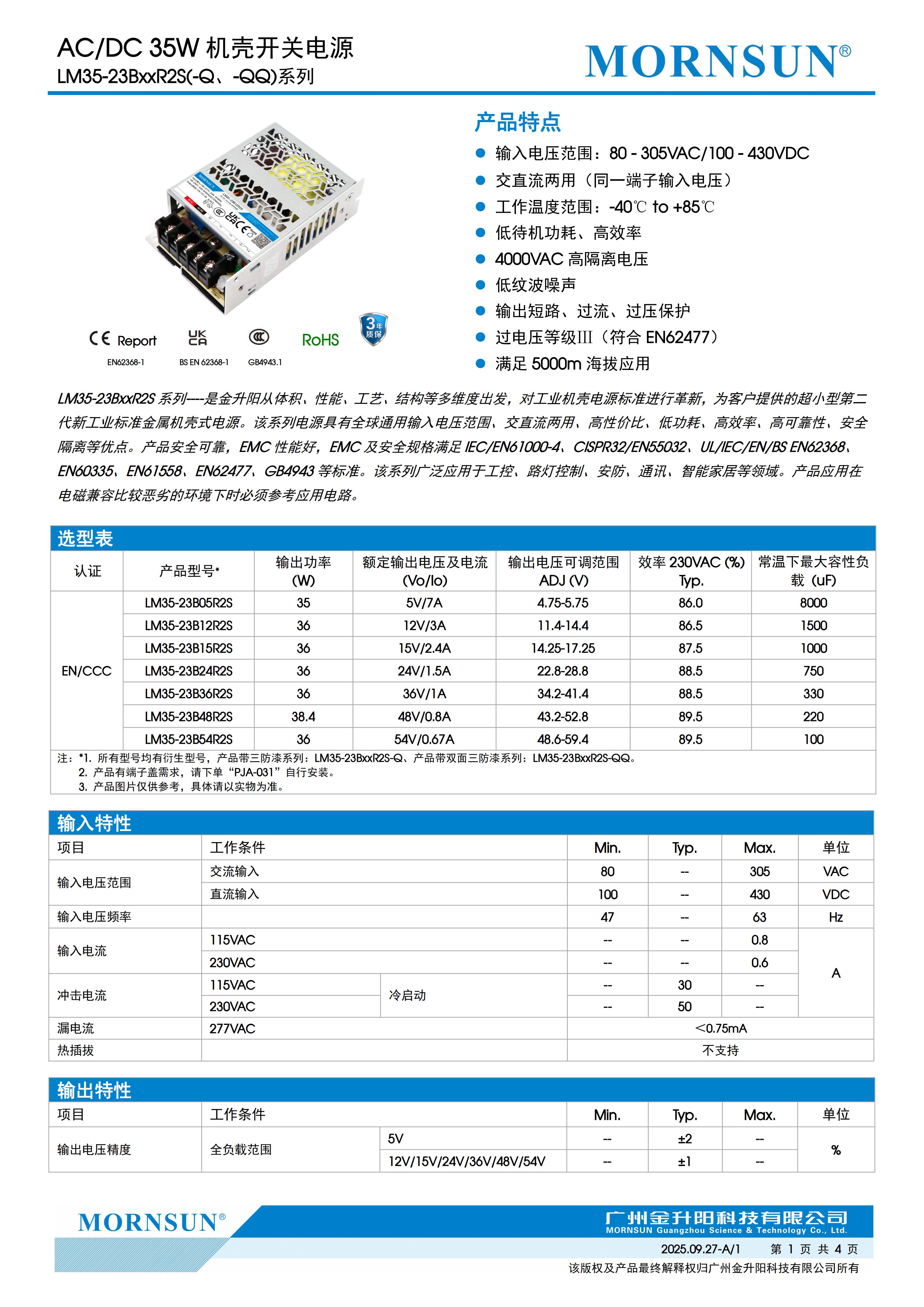 LM35-23BxxR2S 系列----是金升阳从体积、性能、工艺、结构等多维度出发,对工业机壳电源标准进行革新,为客户提供的超小型第二 代新工业标准金属机壳式电源。该系列电源具有全球通用输入电压范围、交直流两用、高性价比、低功耗、高效率、高可靠性、安全 隔离等优点。产品安全可靠,EMC 性能好,EMC 及安全规格满足 IEC/EN61000-4、CISPR32/EN55032、UL/IEC/EN/BS EN62368、 EN60335、EN61558、EN62477、GB4943 等标准。该系列广泛应用于工控、路灯控制、安防、通讯、智能家居等领域。产品应用在 电磁兼容比较恶劣的环境下时必须参考应用电路